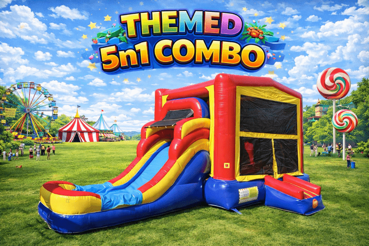 GeneratorThemed 5 N 1 combo:Generator1Dropdown02702259_27023410000 A rugged portable generator built for rentals — compact, wheeled, and designed to power inflatables, lights, sound systems, and other event needs when shore power isn’t available. This unit features a sturdy tubular frame with push handle and durable wheels for easy loading and transport, multiple AC outlets on the control panel for connecting blowers and equipment, and a reliable gasoline engine sized to handle continuous rental duty. Ideal as an accessory for waterslides, combos, themed bounce houses, and events where a dependable, mobile power source is required. Standard safety and operating procedures should be followed: place on level ground, keep dry and well-ventilated, refuel only when engine is off and cool, and never run indoors.